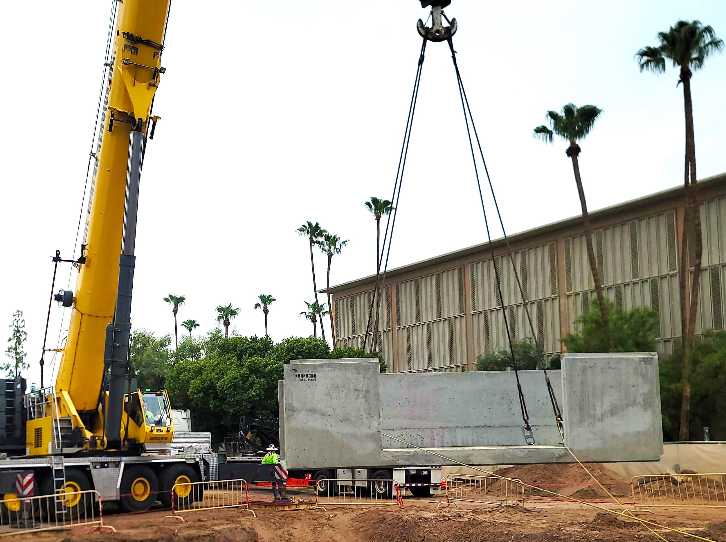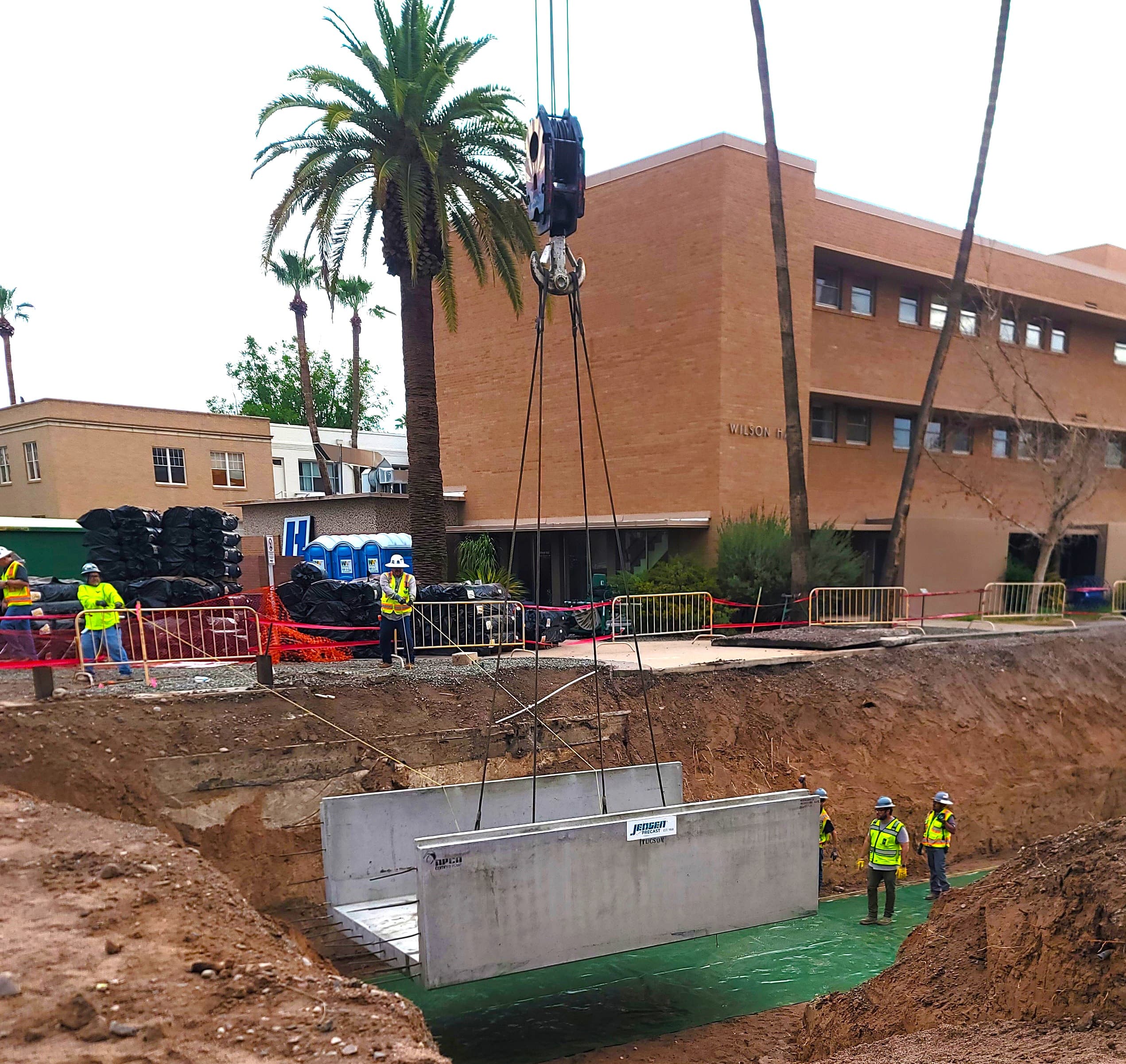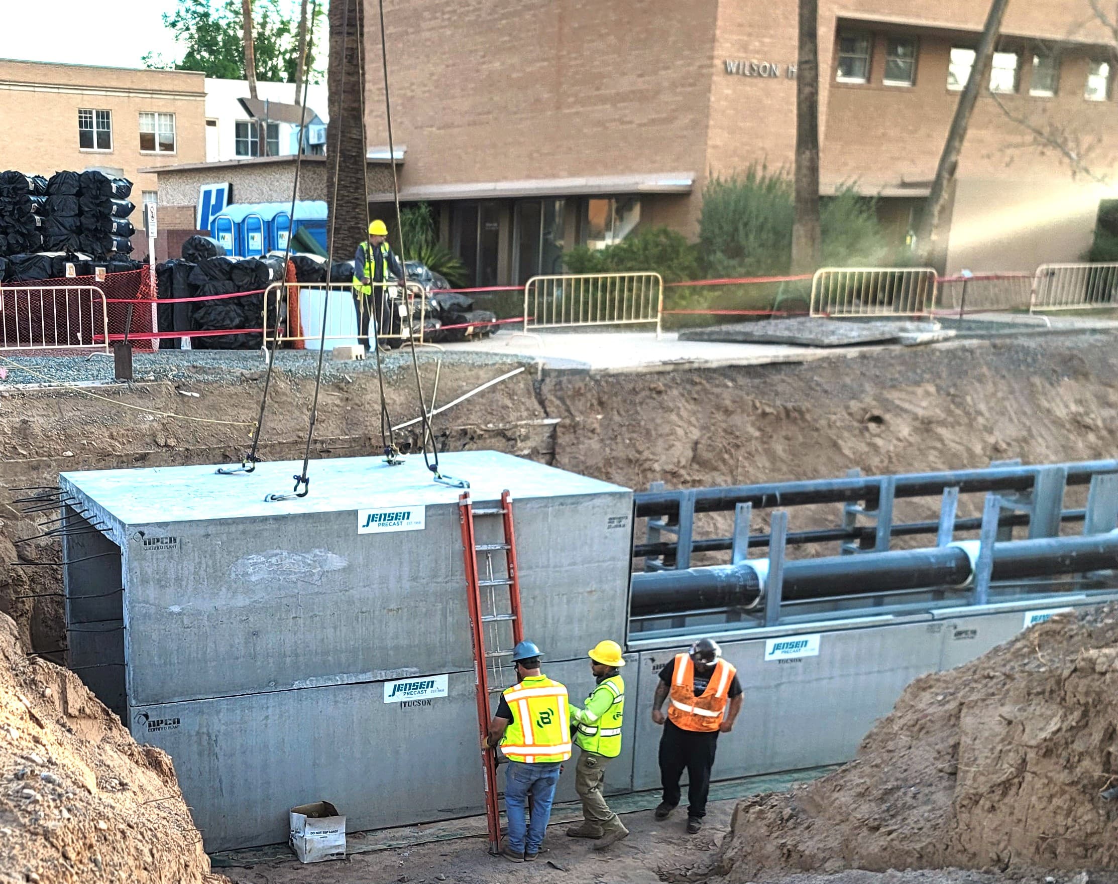 The Jensen manufacturing facility in Tucson, Arizona, had a solution for the deteriorating utility tunnel in Tempe: Forty-eight 8’W x 8’H x 16’L Type II segmental box culvert structures replaced approximately 1,000’ of the underground tunnel network that provides utility services to the western side of the campus. Updating the infrastructure with precast concrete will ensure safe, reliable, and sustainable operations of campus utility and information technology systems while reducing future maintenance needs.