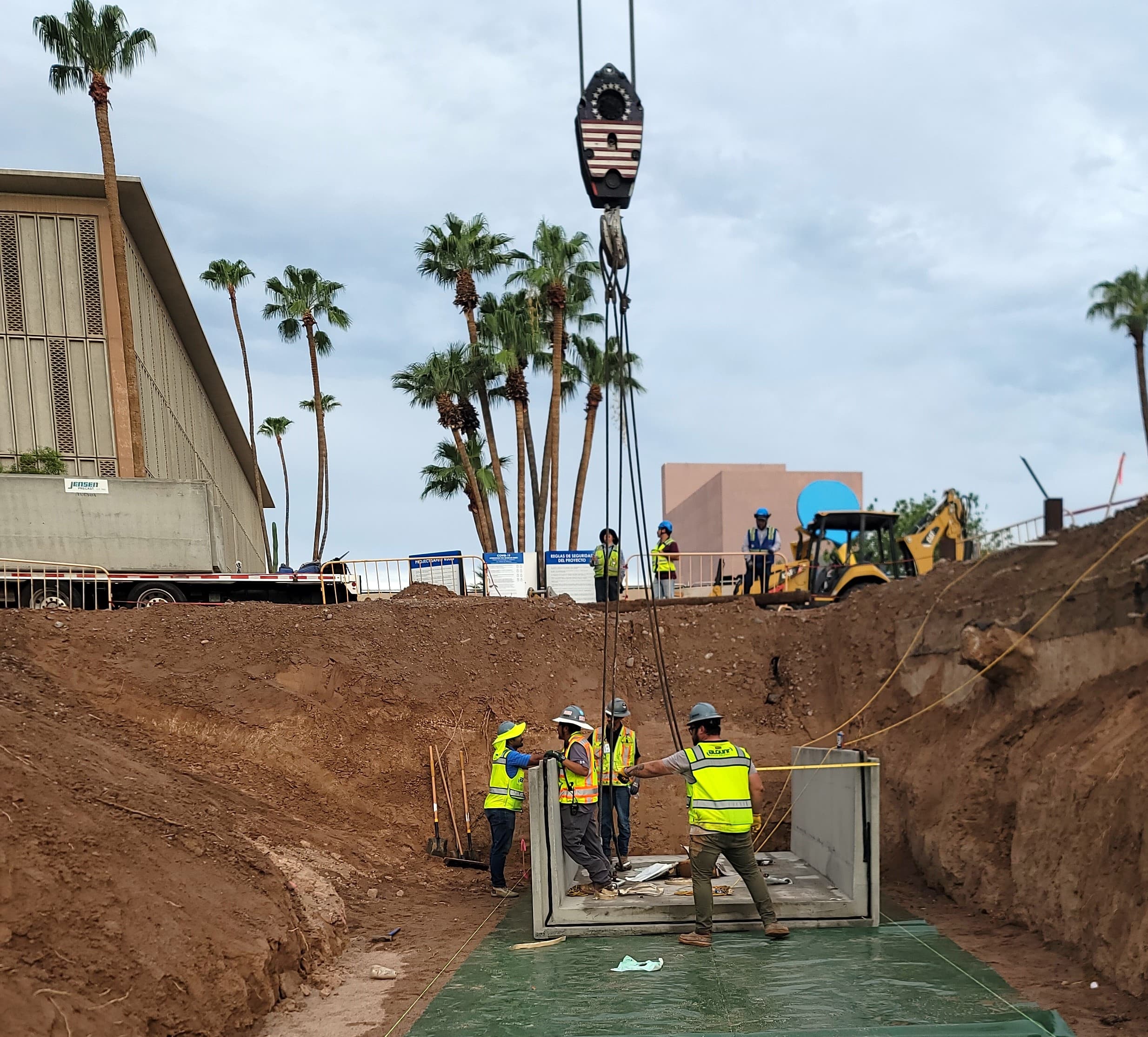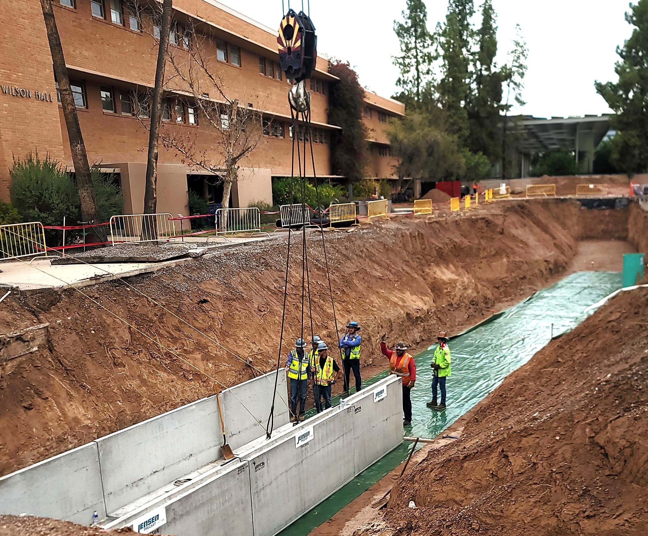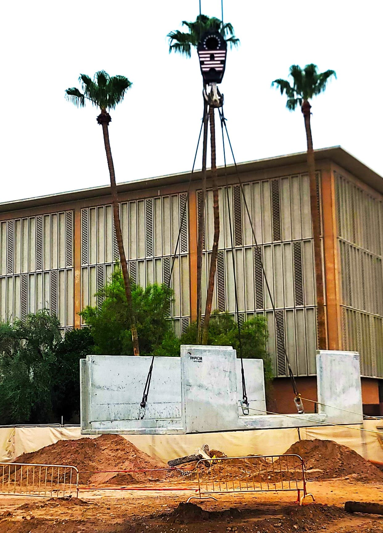 The Jensen manufacturing facility in Tucson, Arizona, had a solution for the deteriorating utility tunnel in Tempe: Forty-eight 8’W x 8’H x 16’L Type II segmental box culvert structures replaced approximately 1,000’ of the underground tunnel network that provides utility services to the western side of the campus. Updating the infrastructure with precast concrete will ensure safe, reliable, and sustainable operations of campus utility and information technology systems while reducing future maintenance needs.