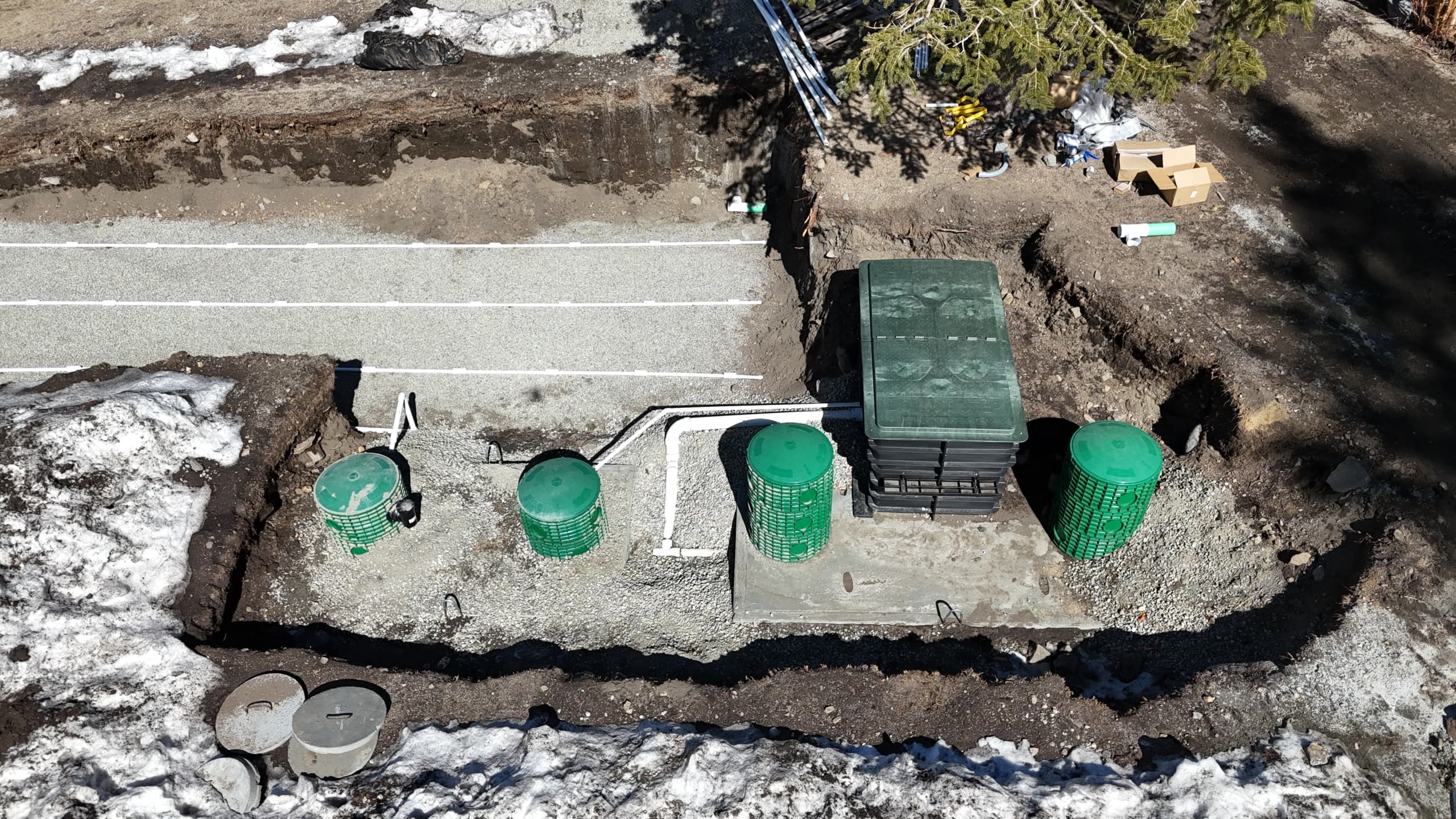 Jensen Infrastructure provided a comprehensive advanced treatment system tailored to meet the homeowner’s needs and ensure regulatory compliance, including two precast concrete tanks, an EZ Treat packed bed media filter, plus pumps and discharge assembly for the pressure distribution field.