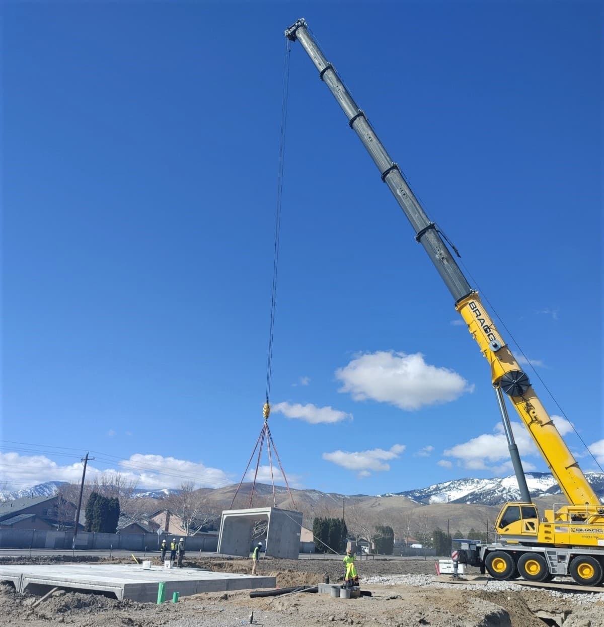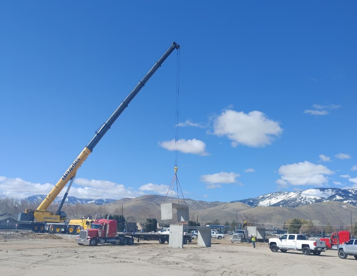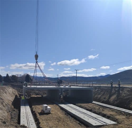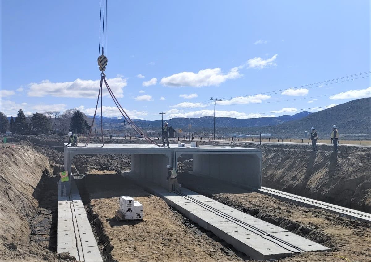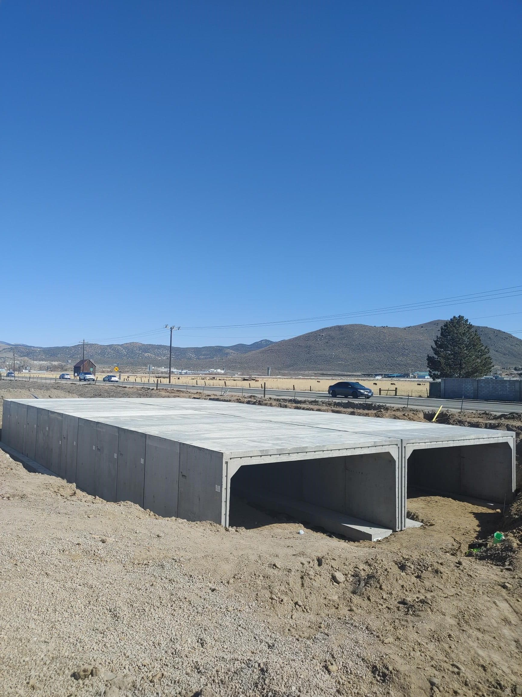 At 30 feet longer and double wide, the 90’ south entrance box culvert is three times the size of the north entrance. It took ongoing logistical coordination between the Sparks plant, the Lockeford plant, and Joy Engineering to keep the project on track. As the pieces were made, the Lockeford plant shipped them 130 miles to a holding yard near the site. The 24 truckloads of box culvert were staged to deliver just-in-time on the contractor’s signal.