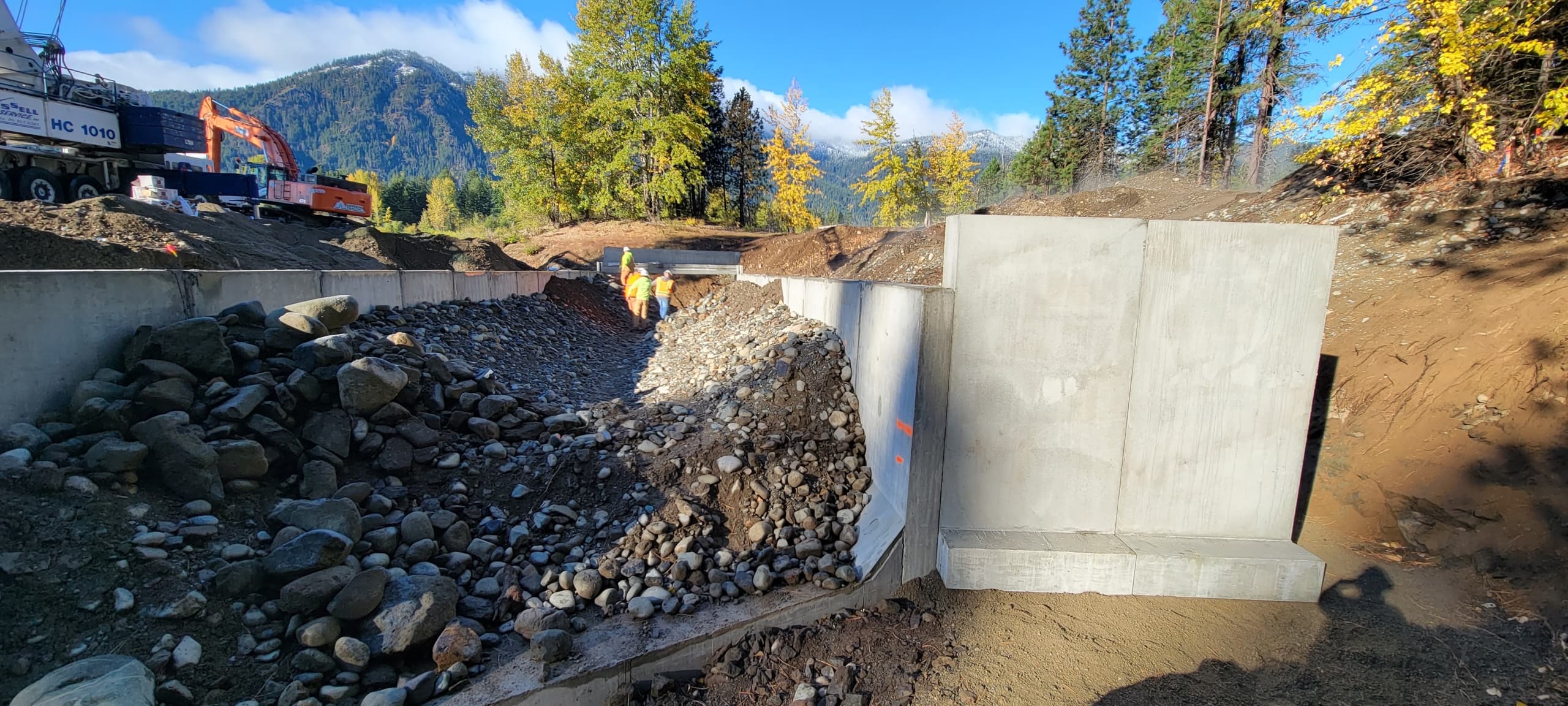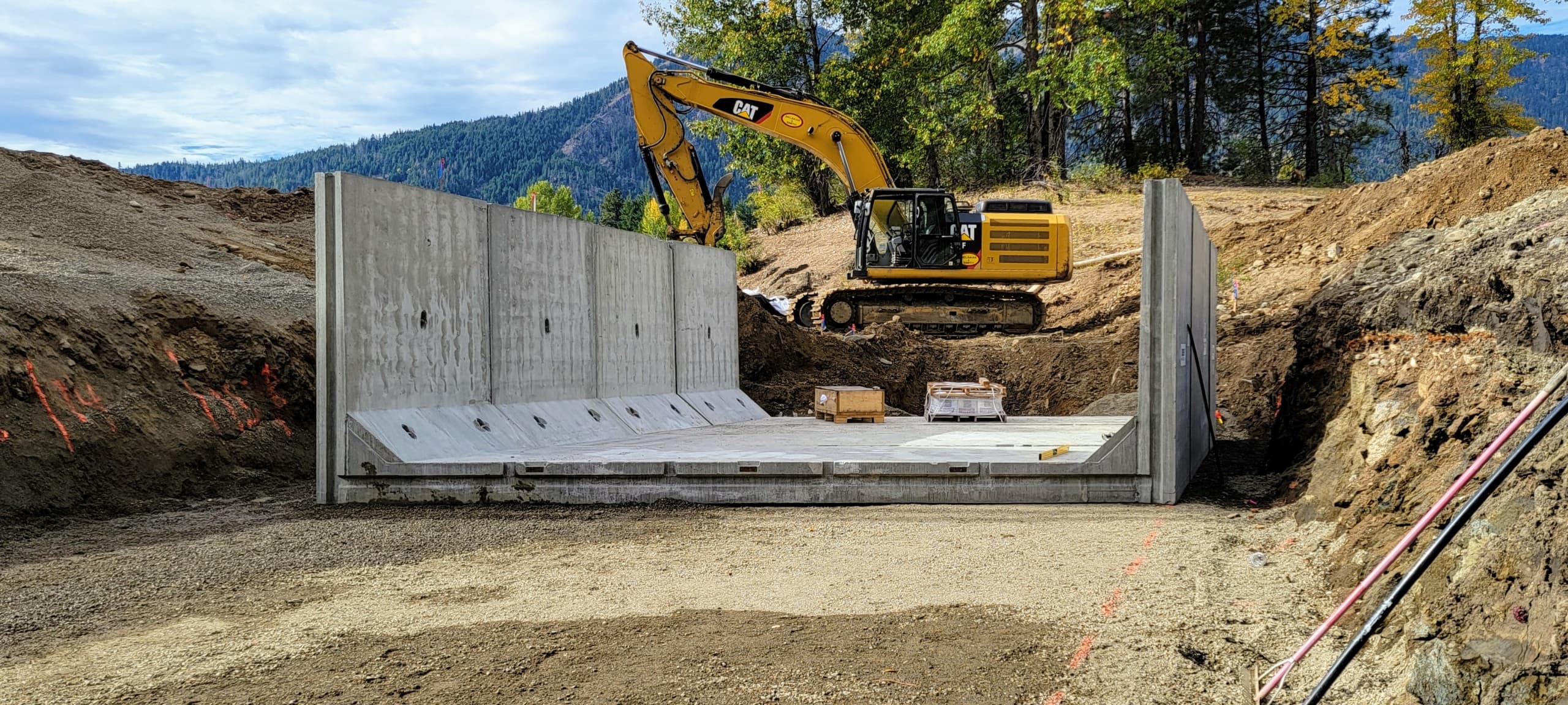 Tim Nyhus, Assistant General Manager for Jensen Puyallup, says the Wish Poosh culvert replacement is typical of many of the barrier culverts that his crew sees throughout the state. It replaces small, dark deteriorating pipe with wide open culvert in a natural streambed. The Wish Poosh culvert is 22’W x 100’L x 10’-8”H. It includes 15 skewed base sections, 12 skewed top sections, and 8 wingwalls.
