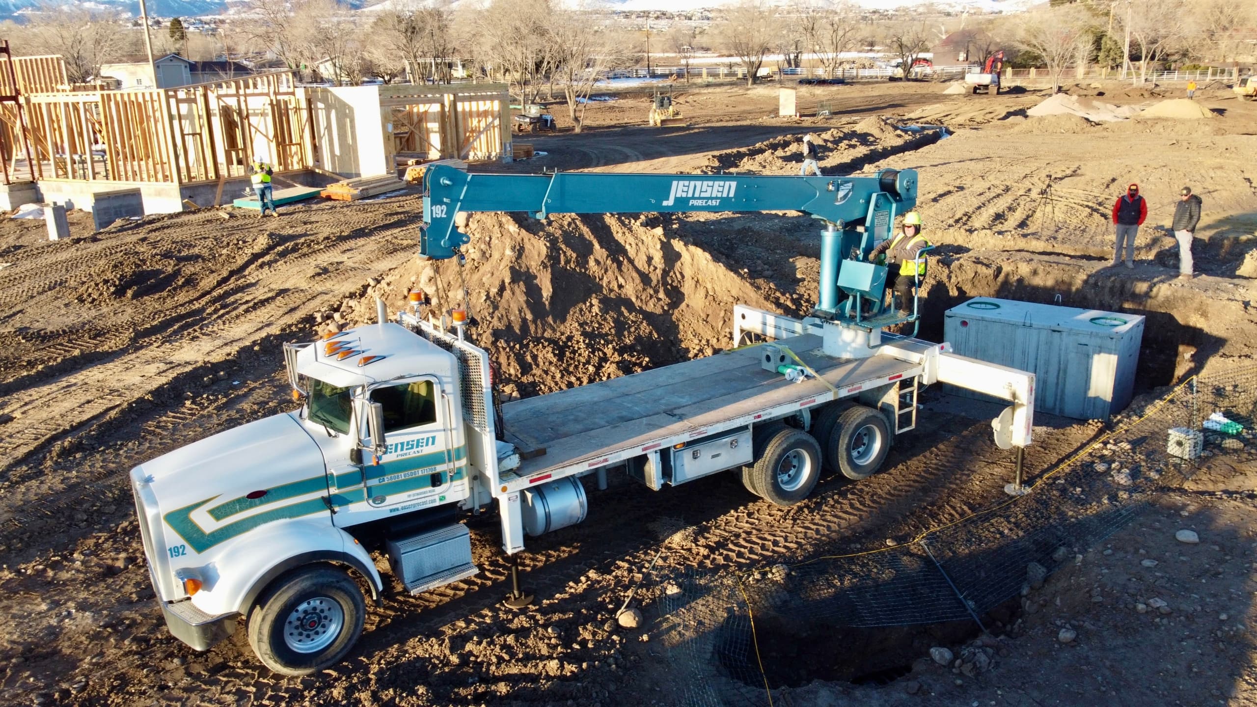 Since the residential project site required two septic tanks, a Jensen boomtruck was affixed with a pup trailer to increase payload. Developers love to ditch the logistics nightmare of managing two behemoth boomtrucks on a narrow jobsite. A pup trailer is a handy tool that saves companies valuable time and money.