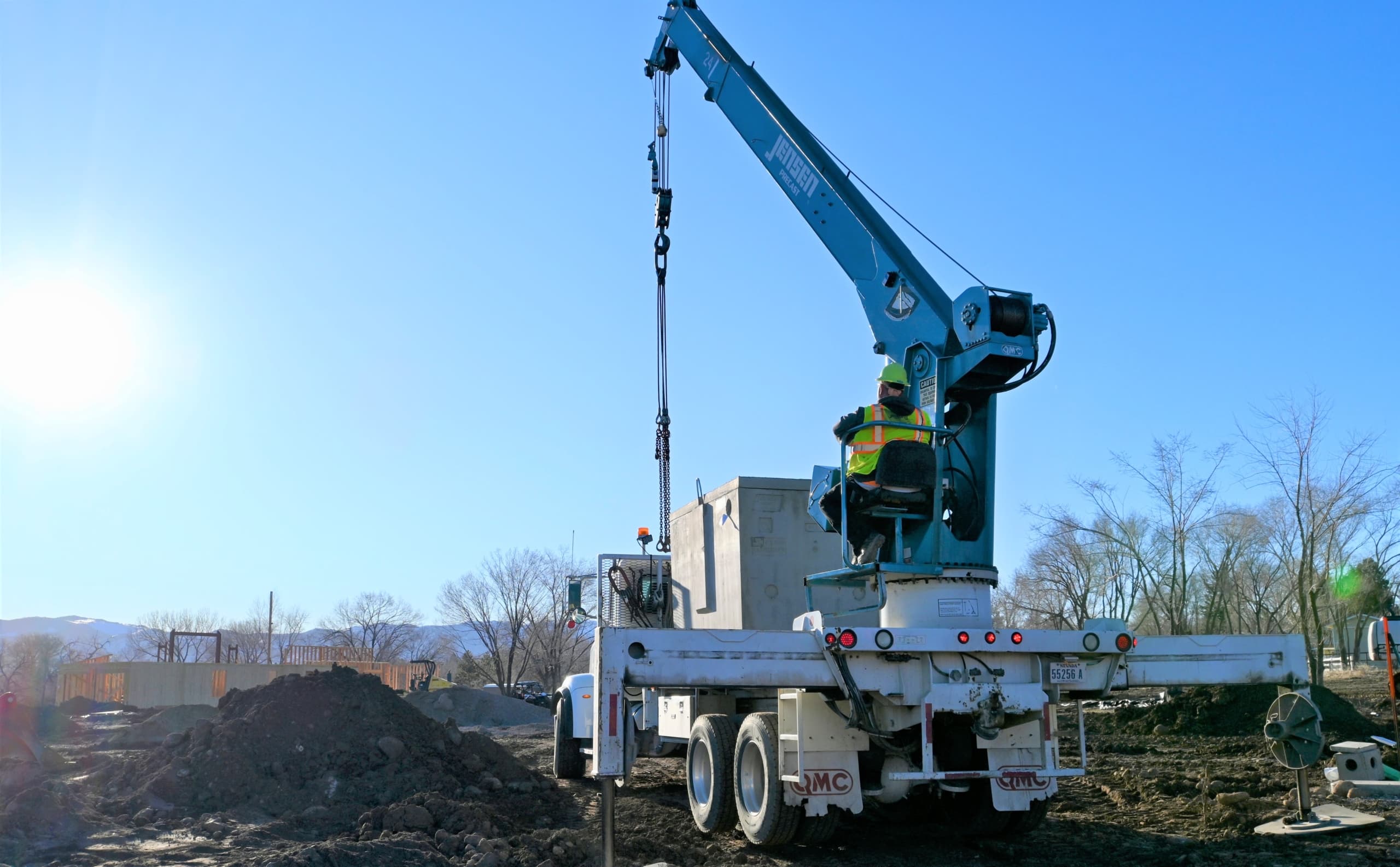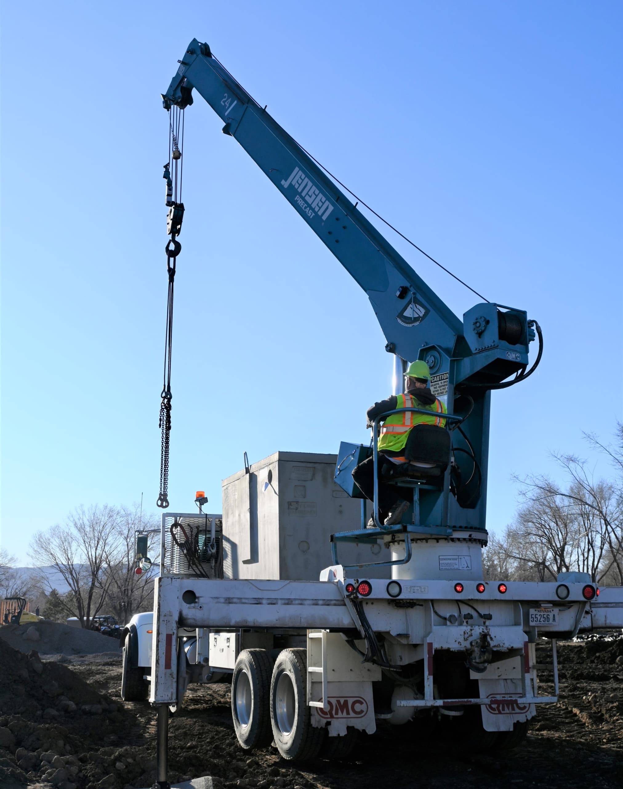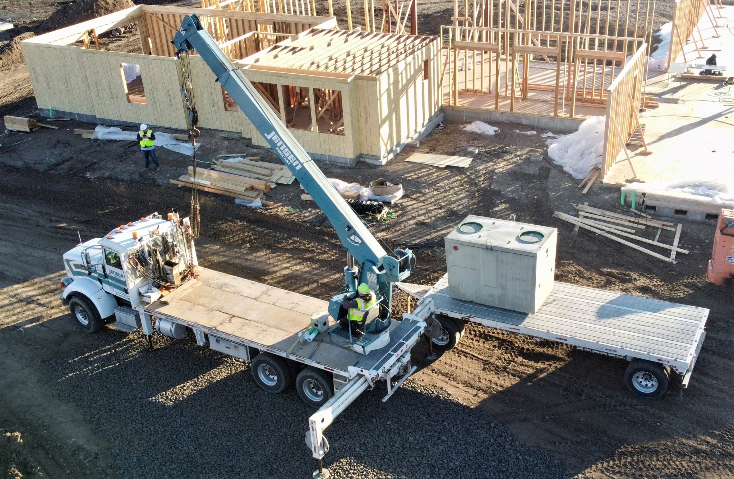 As the sun barely peaked over the horizon, a Jensen boomtruck hauling two precast concrete septic tanks crawled onto the frozen jobsite. With the threat of messy mud looming, workers at Max-Ex required more than just a delivery. They needed someone to help them set the heavy septic tanks as well.