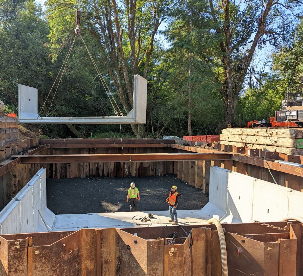 Precast placement started once the streambed preparations were complete. Because of in-water work restrictions, Lewis County needed to purchase culvert materials by a certain date, so the county obtained the 20 precast sections directly from Jensen while site preparations were ongoing. Contractor Quigg Bros. Inc. managed the timing of delivery.