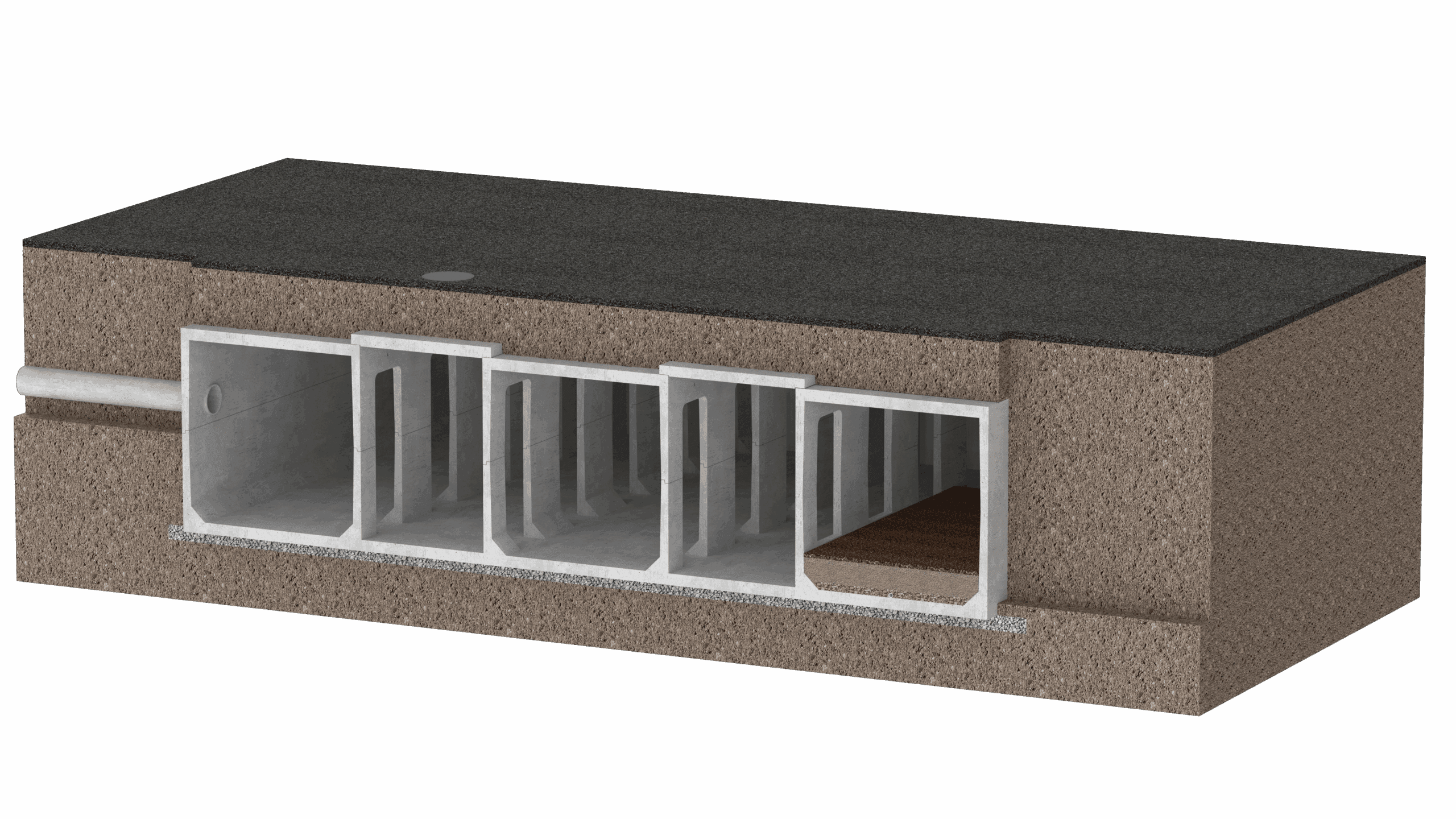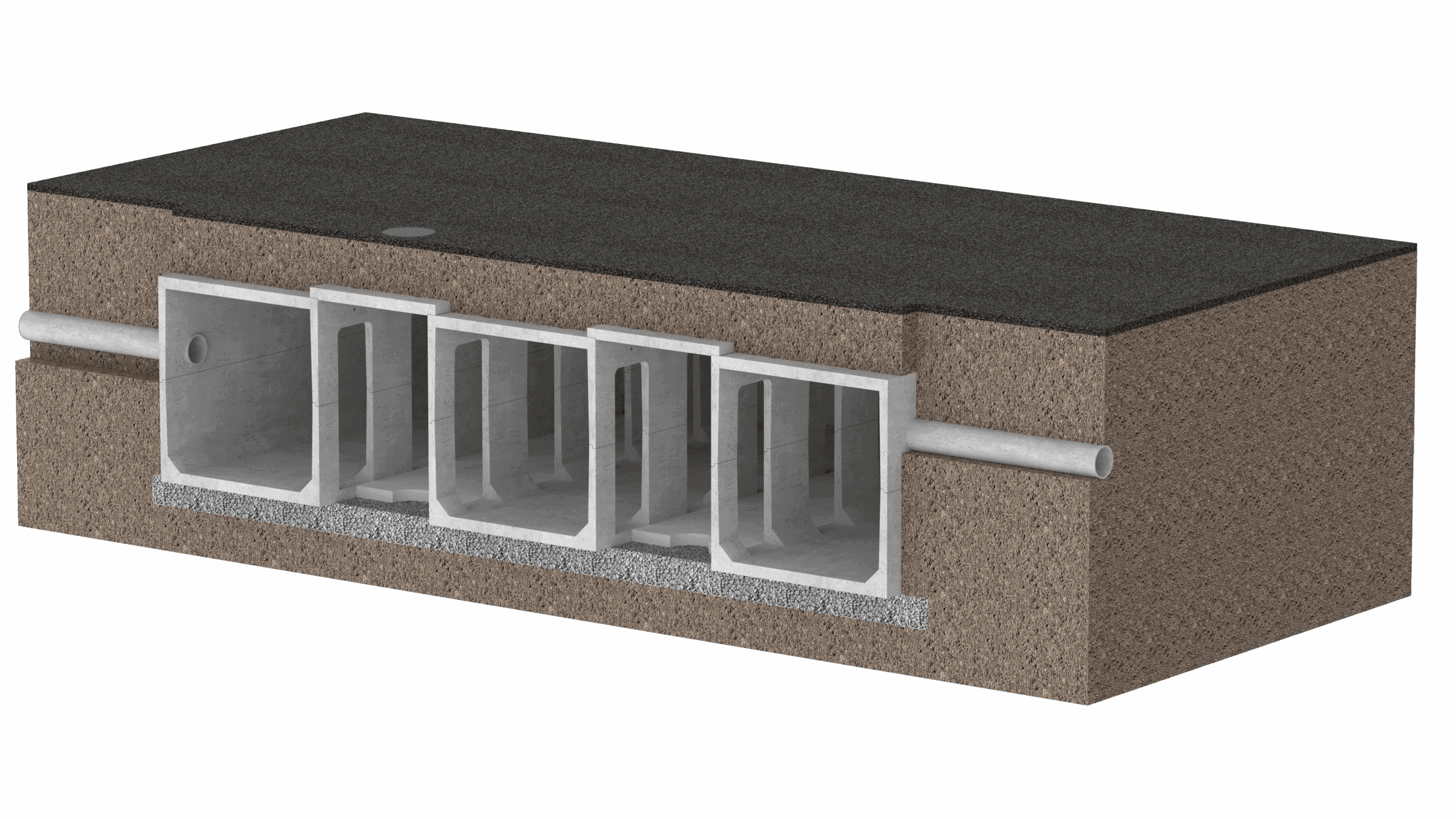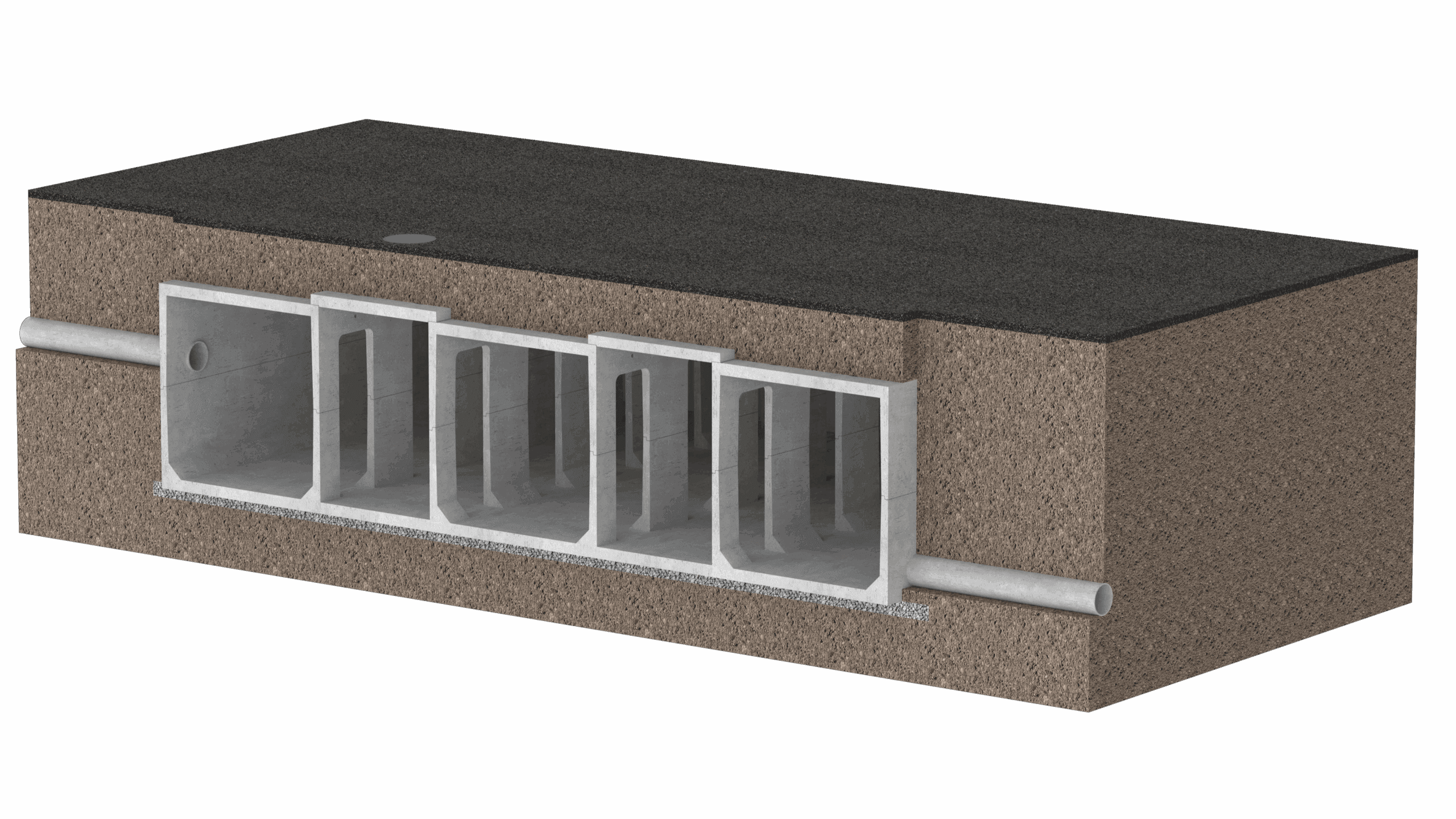 Its modular precast design, featuring large block outs in the base slabs allows stormwater to percolate through the soil, enhancing infiltration rates. The system can be integrated with permeable base layers and infiltration trenches, ensuring that stormwater is absorbed efficiently into the ground.