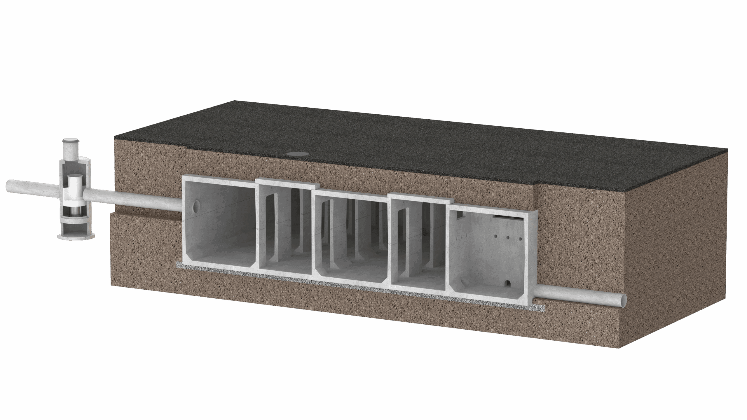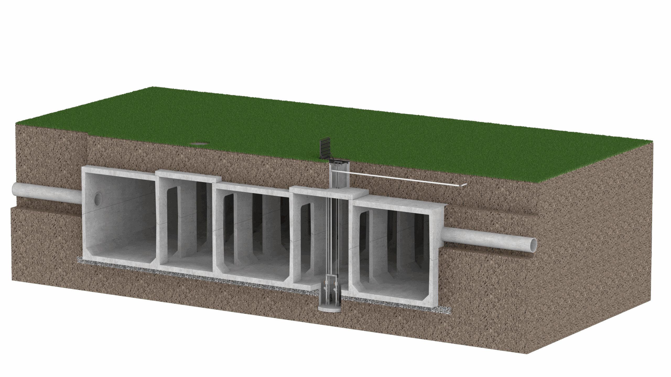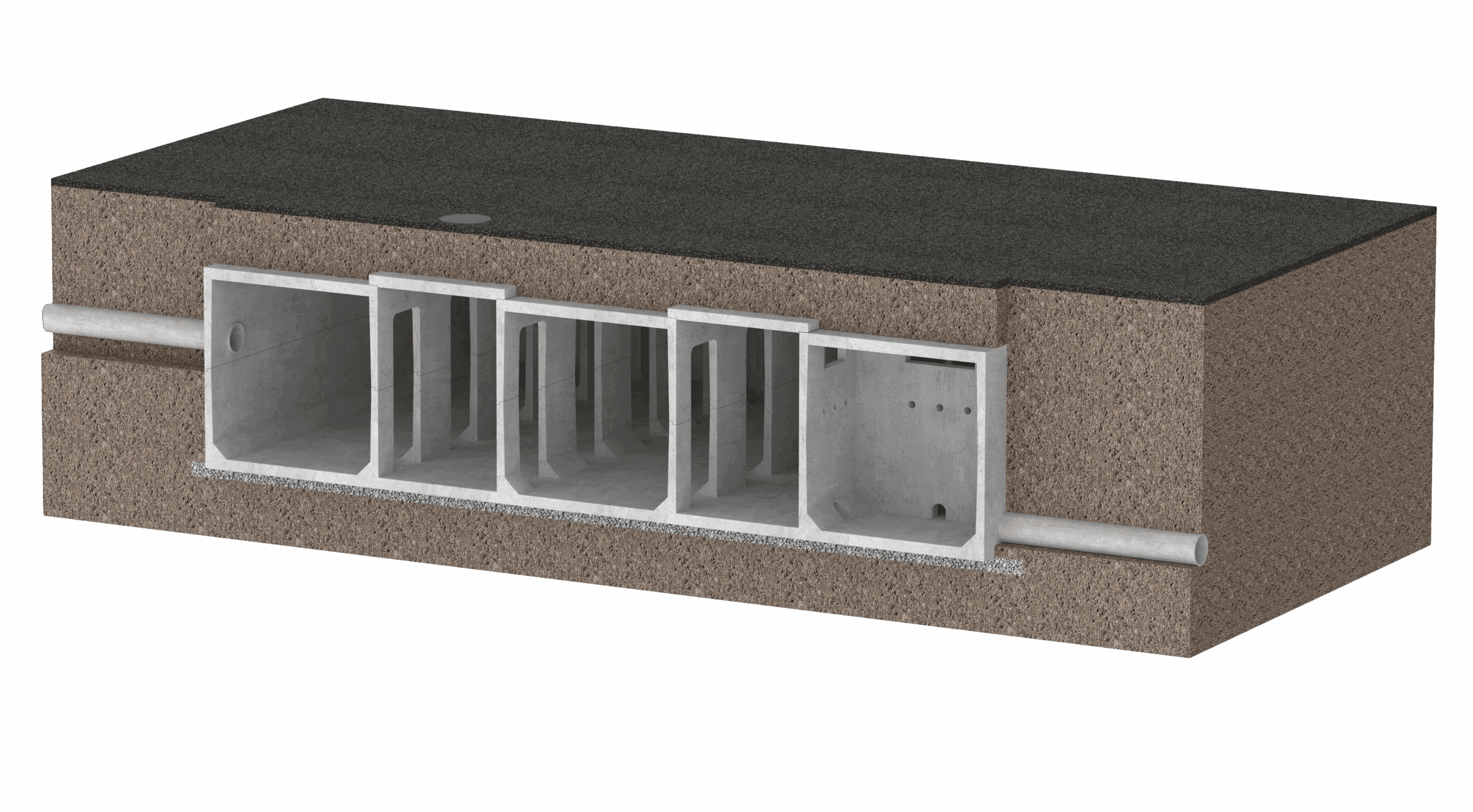 Its modular precast design, featuring large block outs in the base slabs allows stormwater to percolate through the soil, enhancing infiltration rates. The system can be integrated with permeable base layers and infiltration trenches, ensuring that stormwater is absorbed efficiently into the ground.